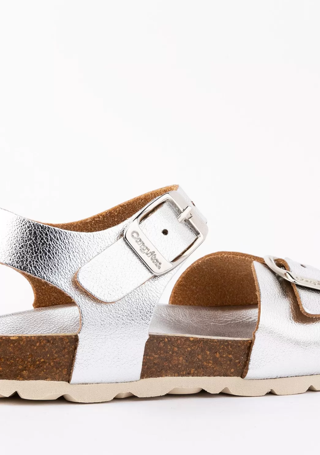 Sandalias de niña tipo bio en color plata metalizada con la planta al tono y dos correas cerradas mediante hebilla para un ajuste perfecto. Con una tira frontal y la otra correa en el tobillo que garantiza la sujeción. Están fabricadas con un material sintético, resistente y ligero, con suela de goma que asegura una mayor protección y durabilidad.