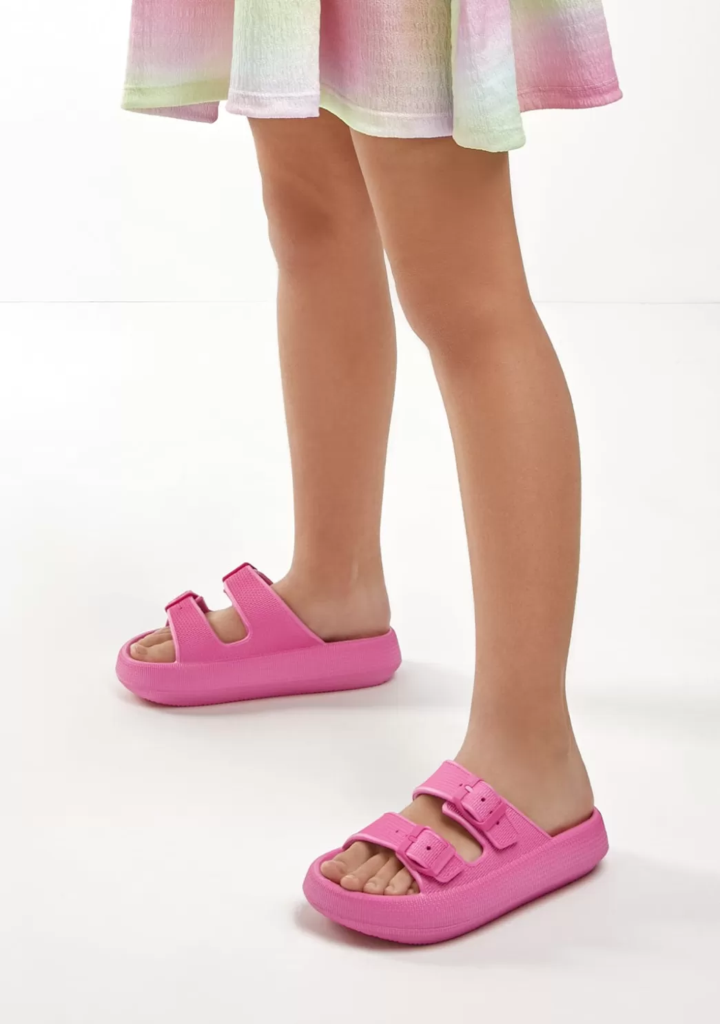 Sandalias de color fucsia. Este modelo de silueta redondeada tiene dos tiras con cierre de hebilla. Están fabricadas con materiales que ofrece un confort extra. También, se amolda al pie de los peques. Cuenta con el logo de B&W en la planta.
