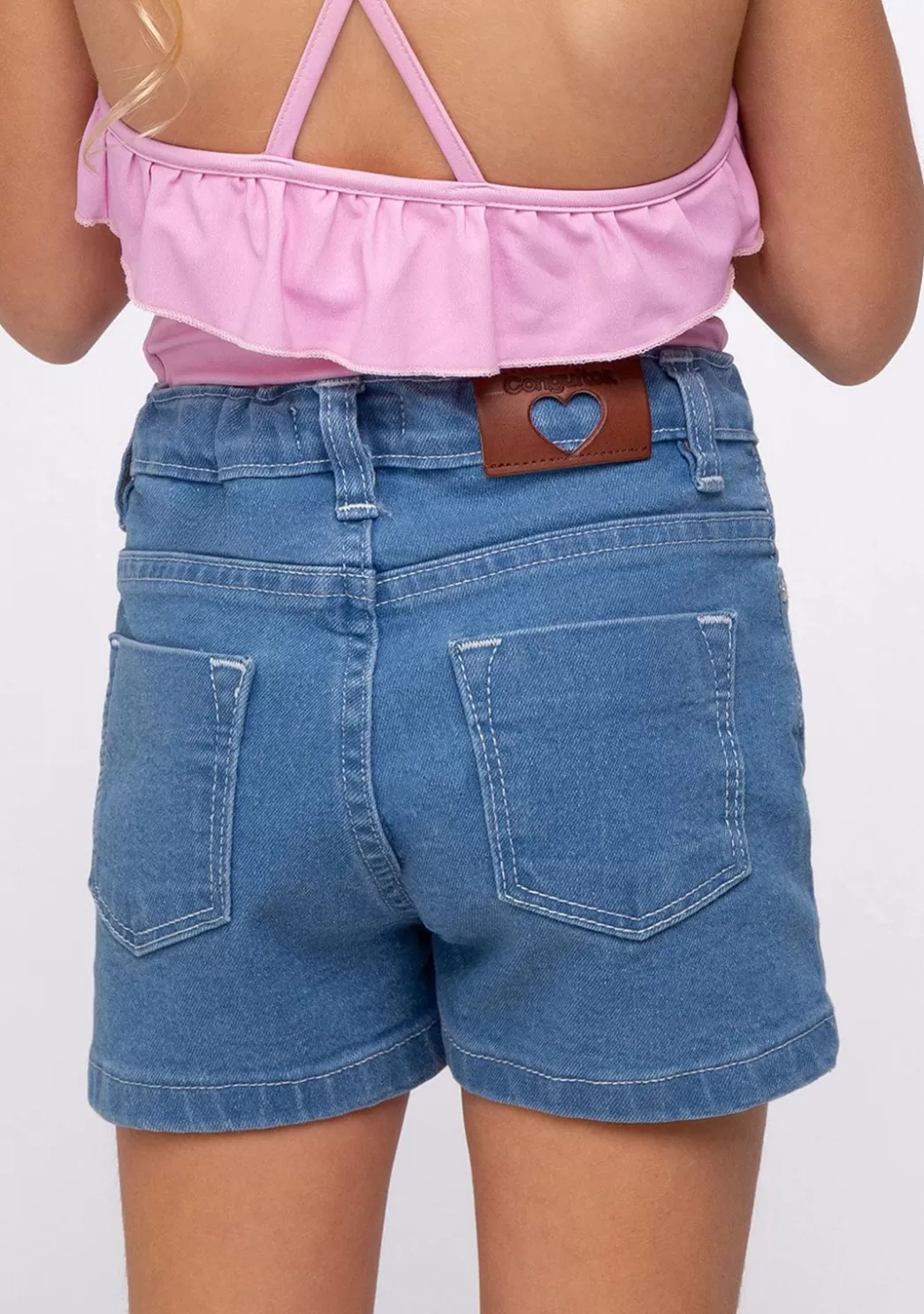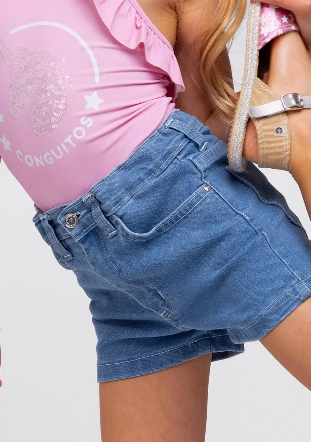 Pantalones cortos de niña estilo vaquero el color azul denim con 5 bolsillos. Estos shorts están fabricados en algodón con cierre de botón y cremallera que se ajusta a la perfección gracias a su cintura elástica.