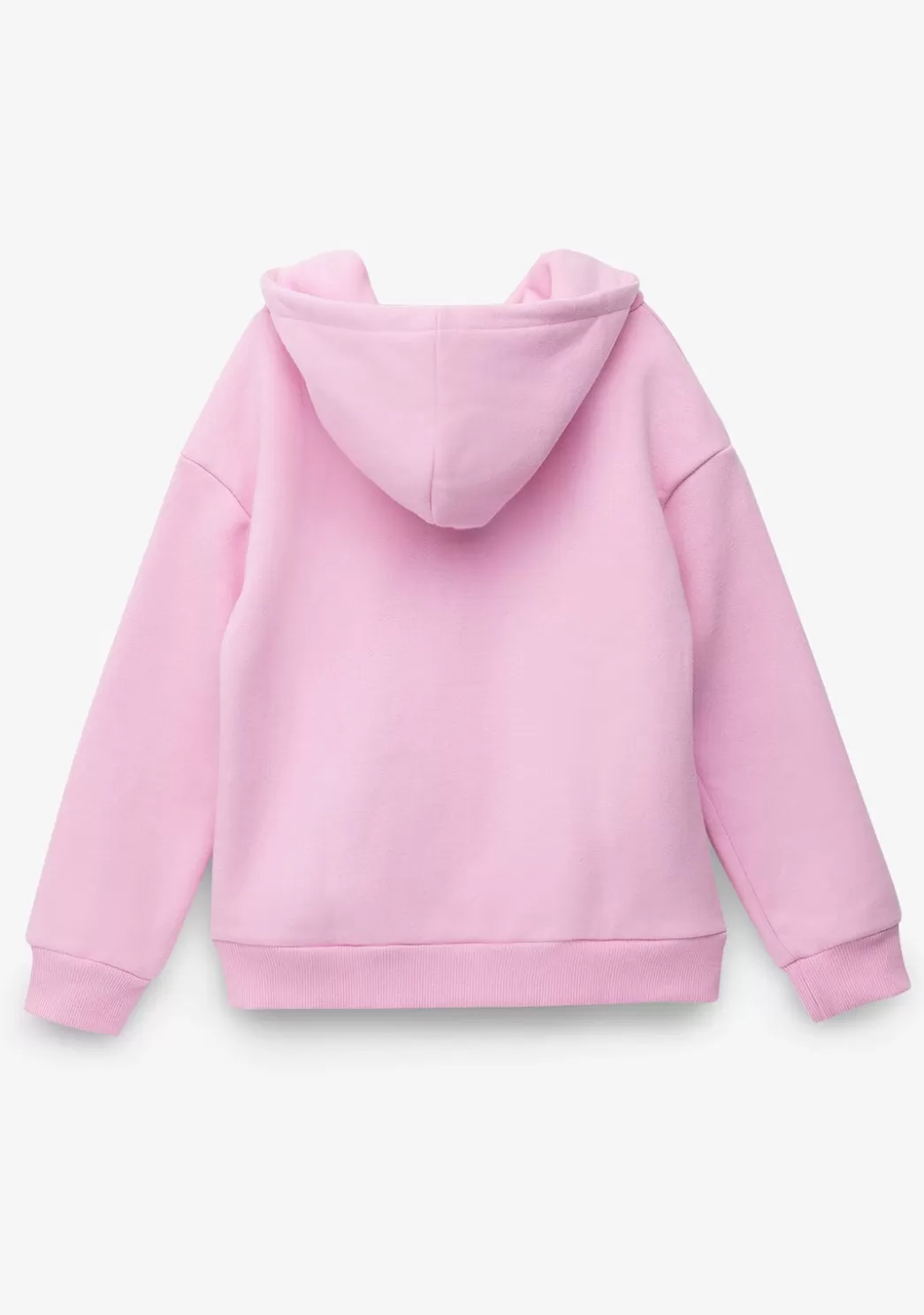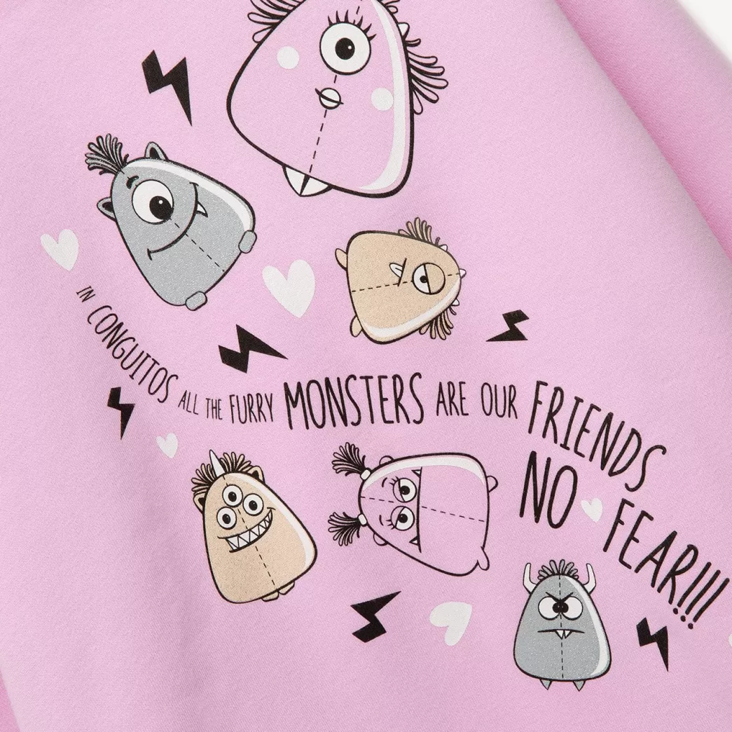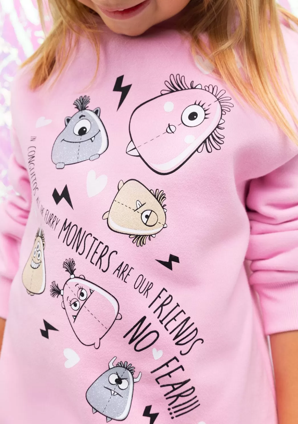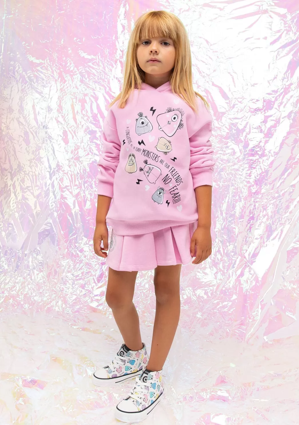 Sudadera de niña con capucha rosa de algodón polar con diseño de monstruos. Esta sudadera tiene el interior afelpado y las mangas con acabado de puño para aislar mejor del frío.