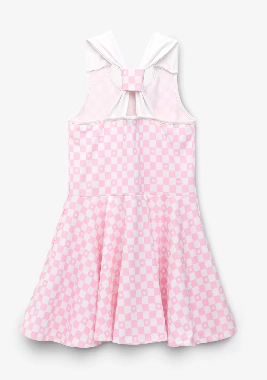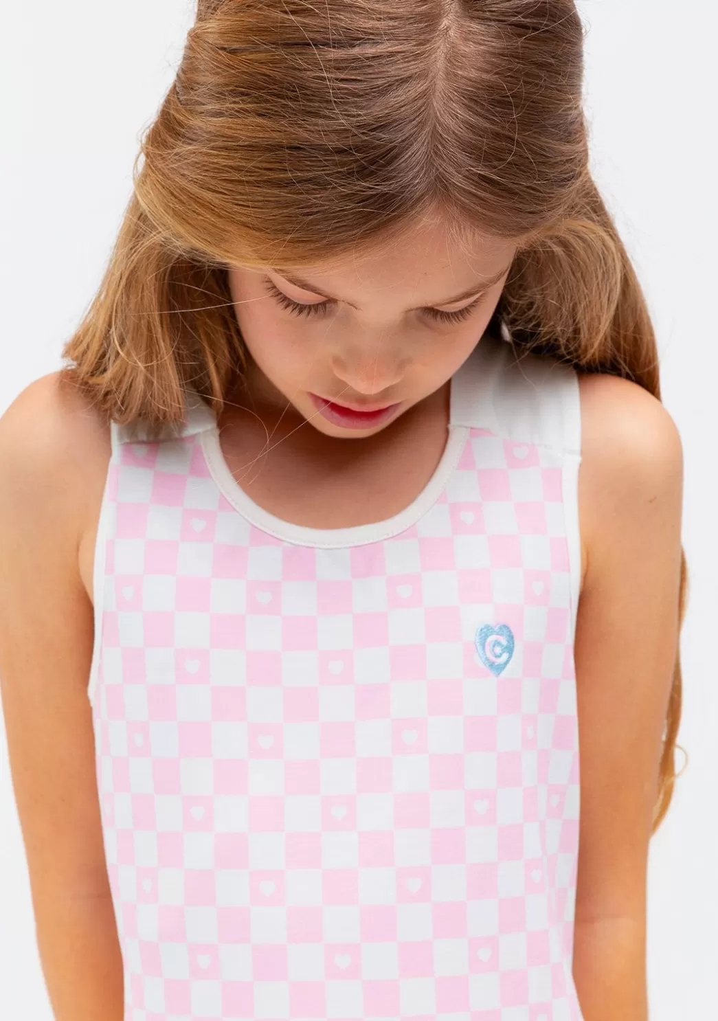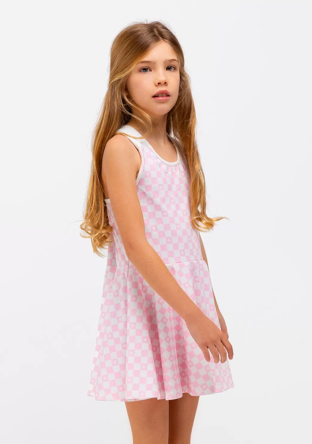 Vestido de niña en color rosa con estampado de cuadros. Tirantes anchos y elásticos. Cuello redondo. Falda con vuelo. Un vestido cómodo y sencillo para los días de verano. Disponible en más colores.