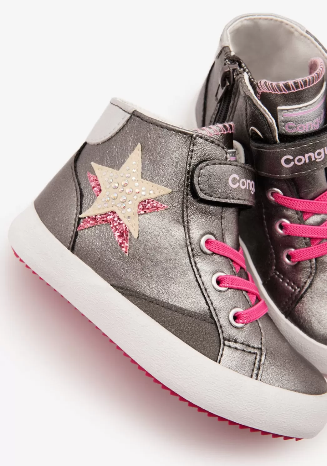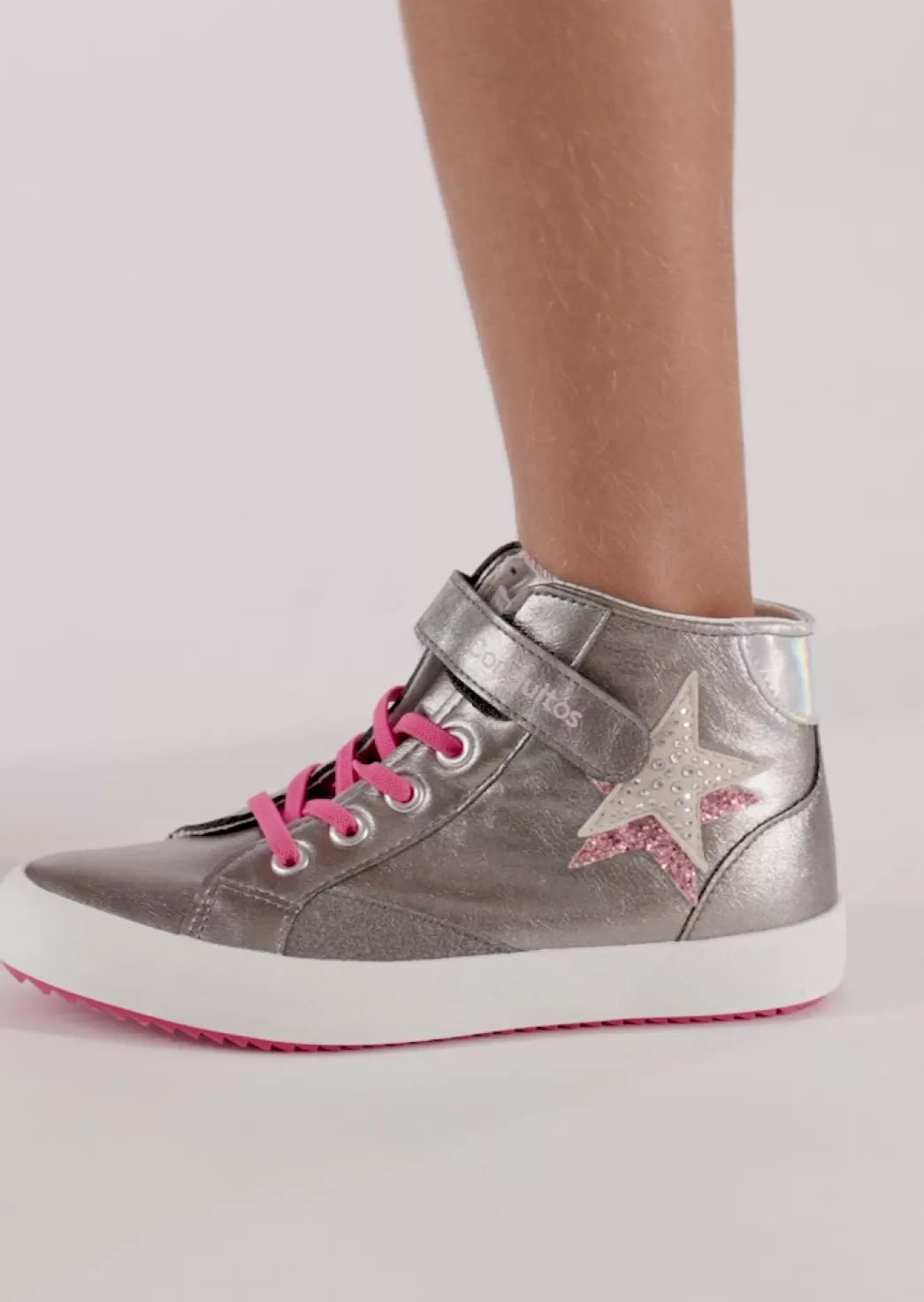 Zapatillas de corte alto con acabado plateado y detalle de estrella en el lateral. Están confeccionadas con ante sintético y plantilla interior textil.