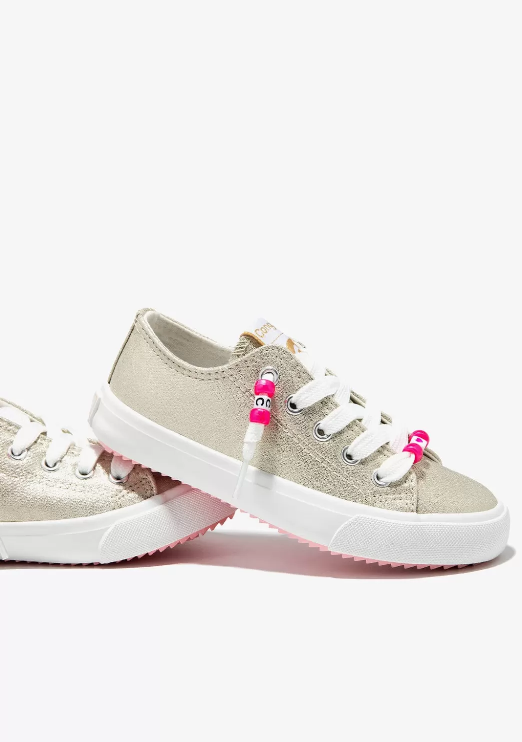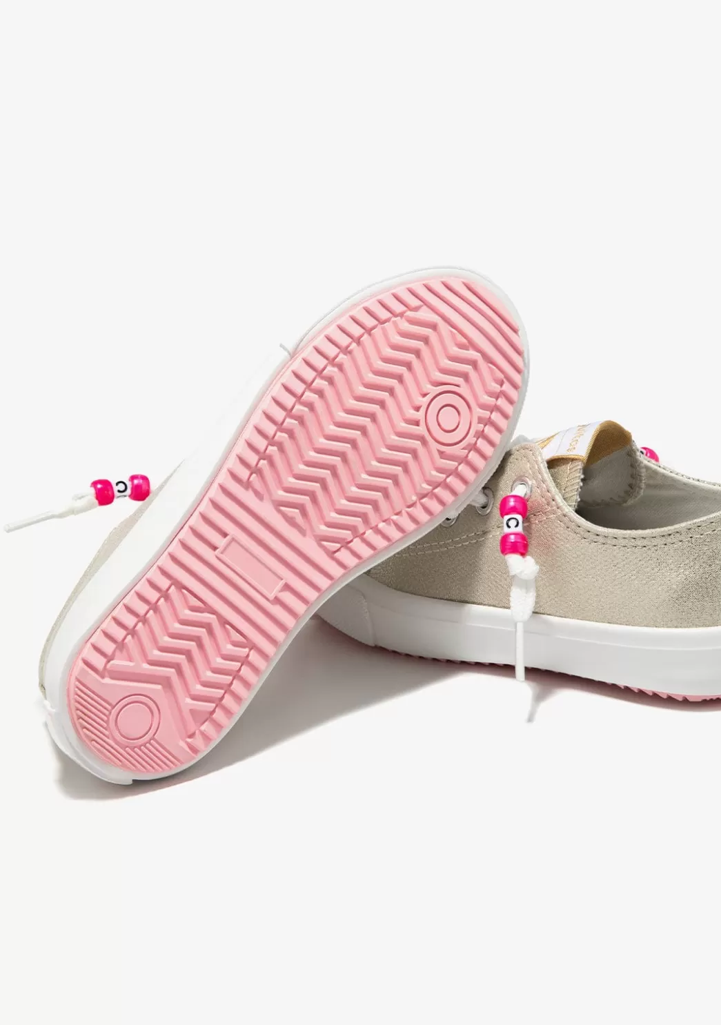 El modelo dorado cuenta con cordones de algodón ajustables decorados con cuentas rosas. Además, su suela cuenta con un refuerzo de goma en la puntera para mayor durabilidad.